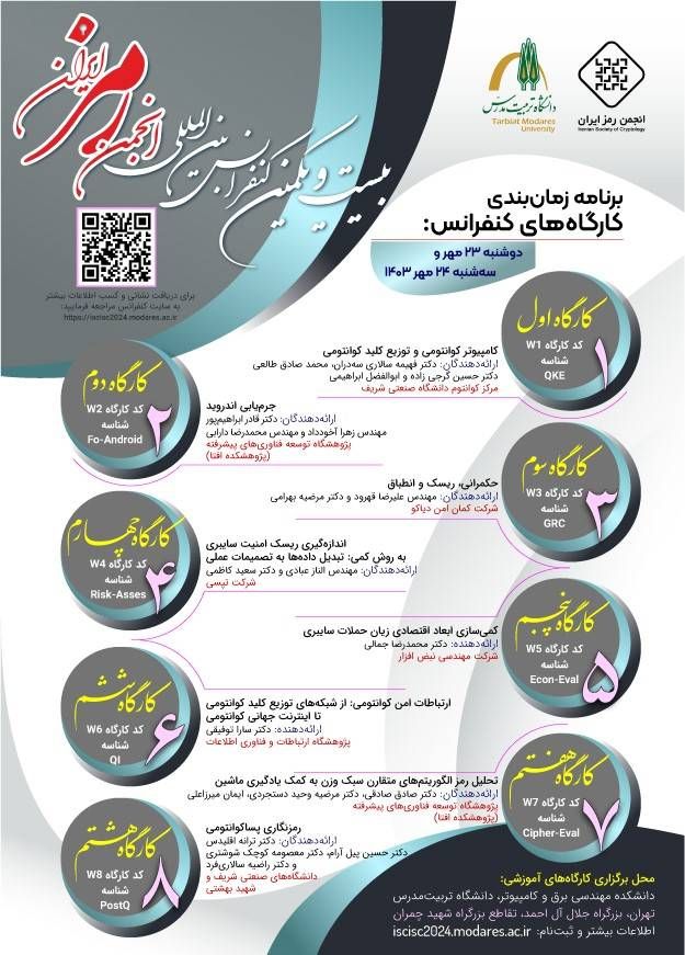 کارگاههای آموزشی انجمن رمز ایران با موضوعات مختلف در زمینههای تحلیل رمز، اینترنت و ارتباطات کوانتومی، رمزنگاری پساکوانتومی، جرمیابی اندروید و کمیسازی اقتصادی امنیت سایبری در روزهای دوشنبه و سه شنبه ۲۳ و ۲۴ مهرماه ۱۴۰۳ در دانشکده مهندسی برق و کامپیوتر دانشگاه تربیت مدرس تهران برگزار میشود.